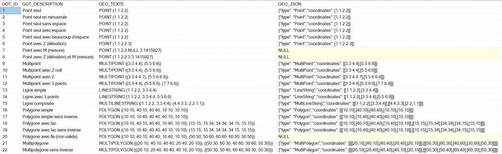 Nous voyons dans ce résultats que certaines transformation des types SQL GEOMETRY en GeoJSON, n’apparaissent pas (marqueur NULL), ceci à cause de la mesure M qui n’existe pas en GeoJSON ou de géométries invalides.